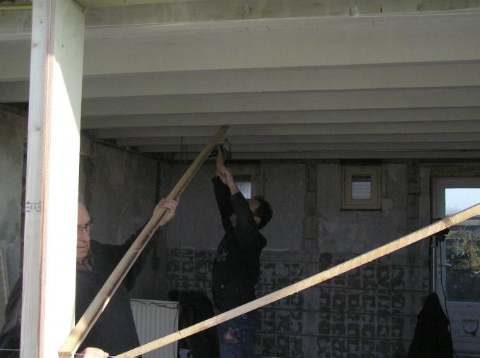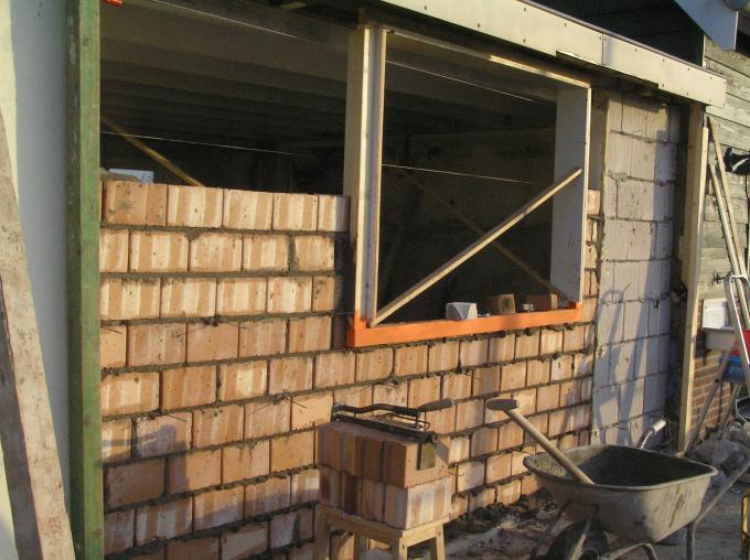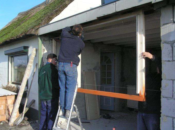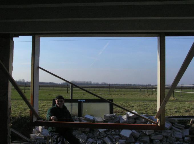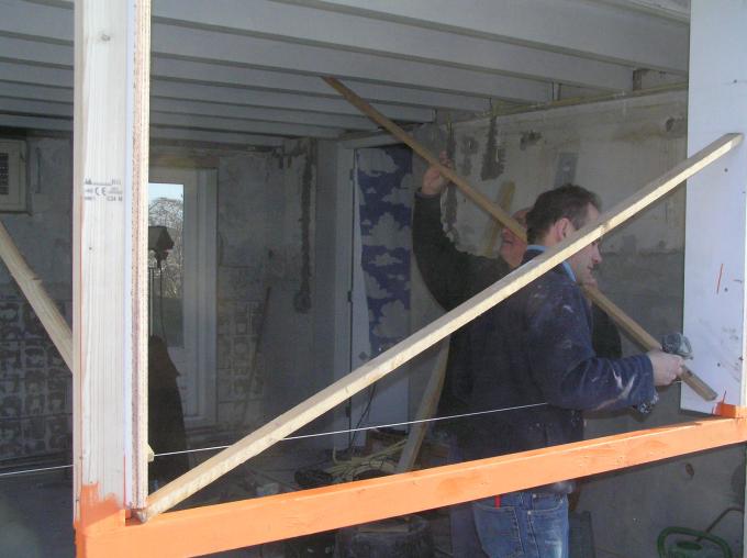 Het stelkozijn wordt geplaatst. Dit is dus niet het echte kozijn (is nog in bestelling), maar een houten raamwerk dat net zo groot is.