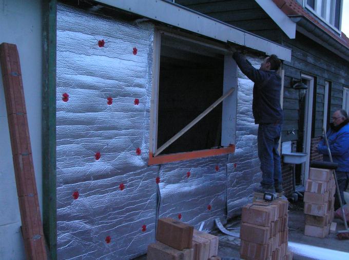 Isolatiefolie en steenwol vullen de toekomstige spouw op.