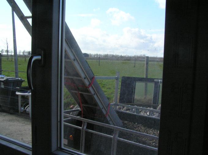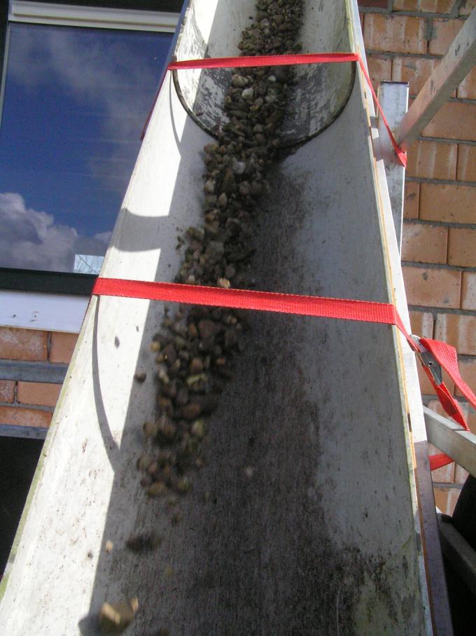 Bij de aannemer hebben we wat doorgezaagde pijpen geleend. Deze hebben we vastgezet op een ladder, zodat we het grind eenvoudig erin kunnen scheppen. Het valt dan in de aanhanger.