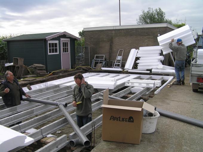De afvoerbuizen van WC, badkamer, keukenblok e.d. worden alvast onder de vloer gewerkt.