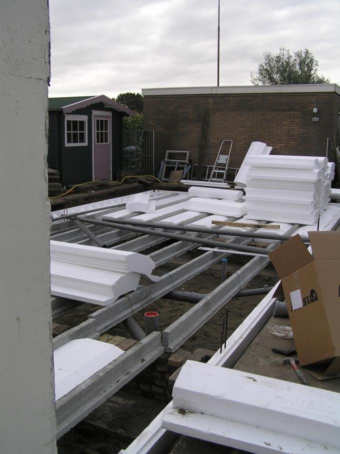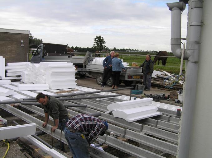 Tussen de vloerbalken worden grote piepschuim blokken ingeklemd.