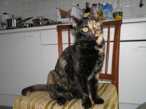 Eenmaal bij ons in huis kroop ze weg in de donkerste hoekjes. Maar honger dreef haar toch naar het voer en de kattenbak was haar gelukkig ook niet onbekend. Zo moest ze een paar weken in de keuken bivakkeren. Dat vond ze niet leuk en als Wytske 's nachts naar de wc moest, greep Poes haar naar haar been. 2 x 5 Nageltjes en een bek vol tanden.... Dat moest natuurlijk afgeleerd worden. Wat wel opviel was dat Poes niet op het aanrecht kwam en nooit op tafel.