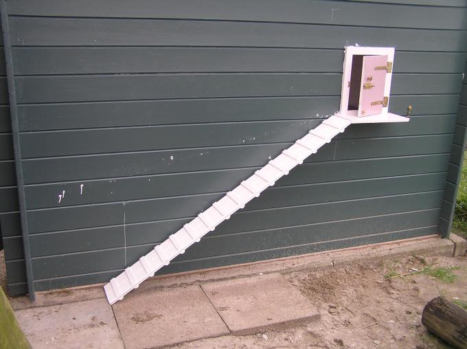 Een kippentrap zat niet in het bouwpakket van het tuinhuisje, dus zelf maar een mooi trapje gemaakt.
