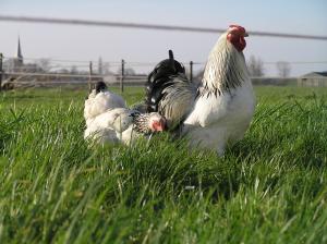 Via Marktplaats hadden we al snel iemand gevonden die een toompje wyandottes over had. Dus wij met verhuisdozen die kant op. "Hoeveel wil je er hebben?", vroeg hij. Kortom, we konden ze gewoon uitzoeken. Hij had een heel weitje vol met die beesten, allemaal van de kleurslag "columbia". Uiteindelijk gingen we met 6 hennen en een haan weer huiswaarts.