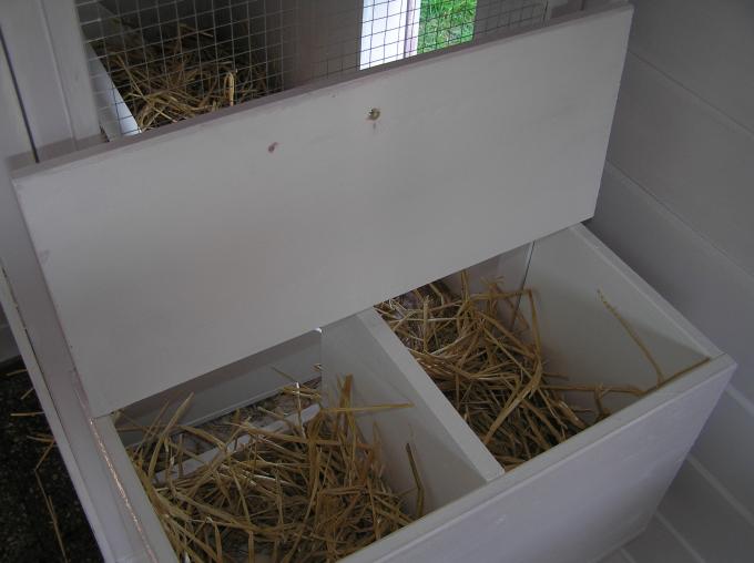 De legnestmodule. Hier kunnen twee kippen tegelijk eitjes in leggen.