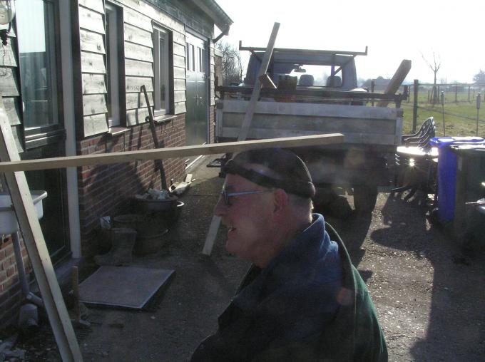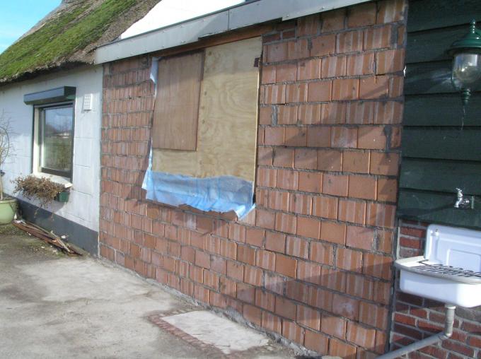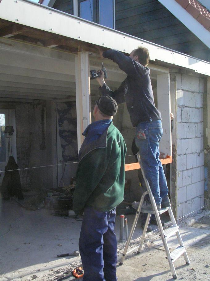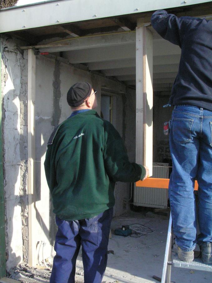 Het stelkozijn wordt geplaatst. Dit is dus niet het echte kozijn (is nog in bestelling), maar een houten raamwerk dat net zo groot is.