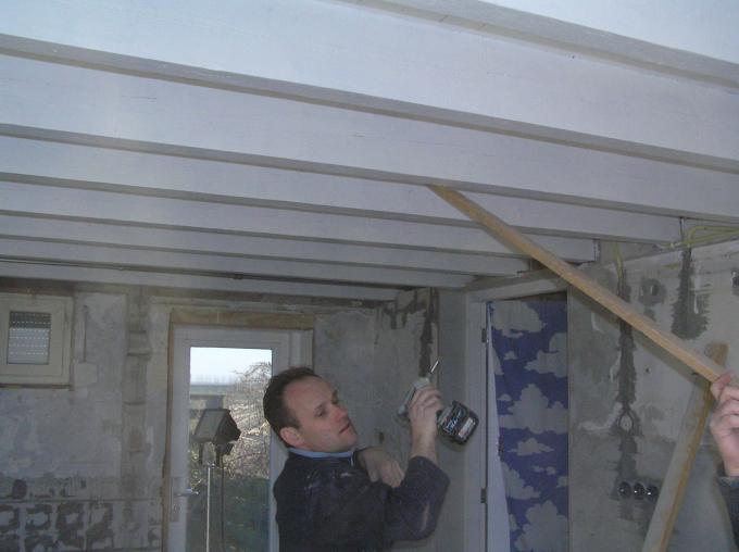 De muur is bijna klaar. Nog even de latjes eruit prutsen en de gaatjes vullen, en dan is de muur weer helemaal glad. |