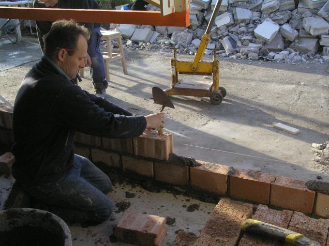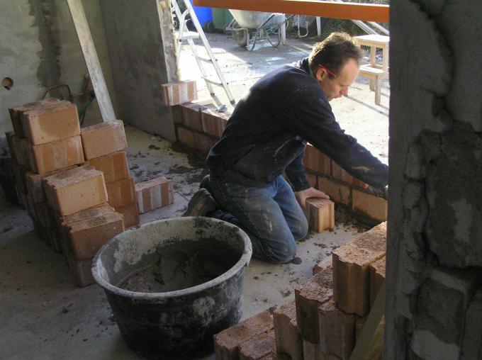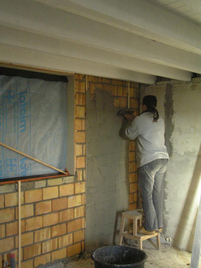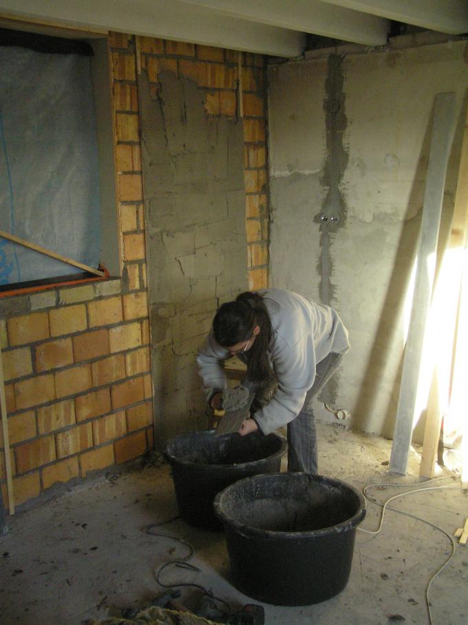 Na ruim een week is de muur hard genoeg om af te werken. Wytske wordt inmiddels ook handig in het stucwerk.
