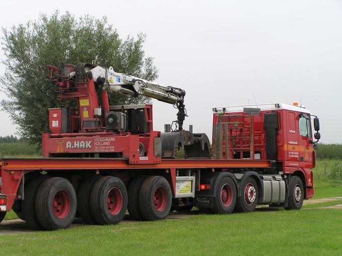 Terwijl de trailer langzaam achteruit rijdt, legt de chauffeur de platen op de grond m.b.v. een hijskraantje.  |