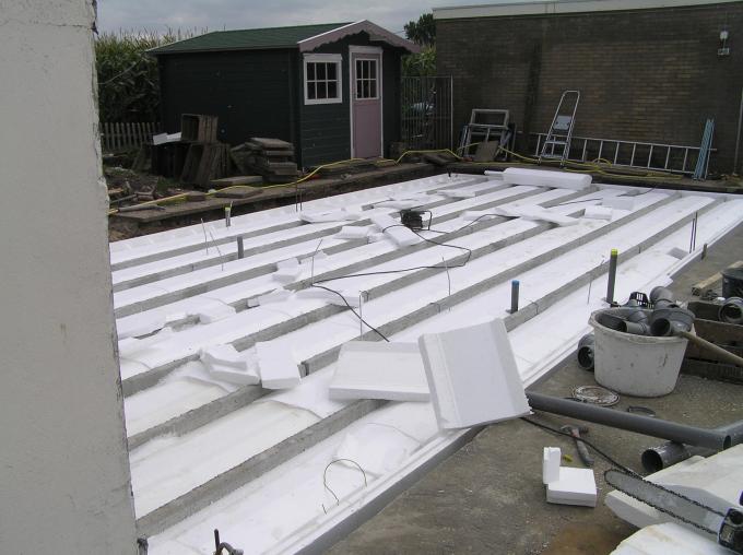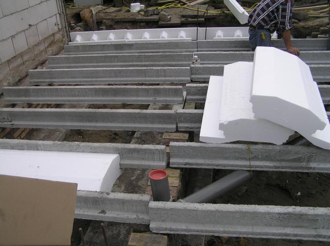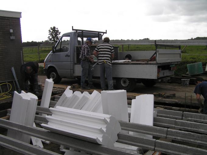 Tussen de vloerbalken worden grote piepschuim blokken ingeklemd.