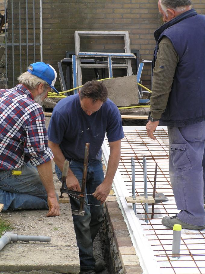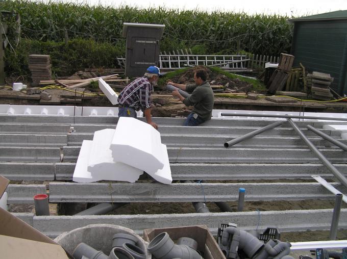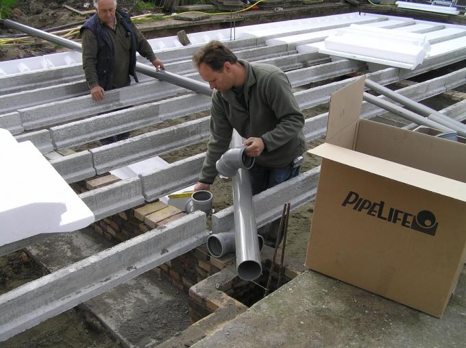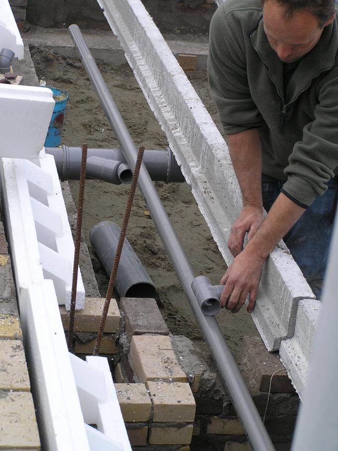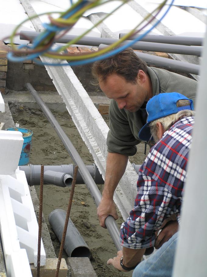 De afvoerbuizen van WC, badkamer, keukenblok e.d. worden alvast onder de vloer gewerkt.