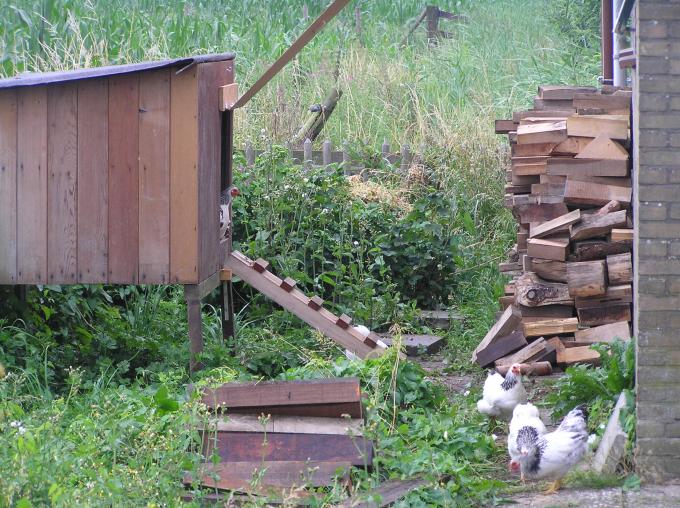 Dat hok heb ik vervolgens op 4 poten gezet (eveneens achter de garage), er een trapje en deurtje bijgemaakt en zie daar: een kippenhok!