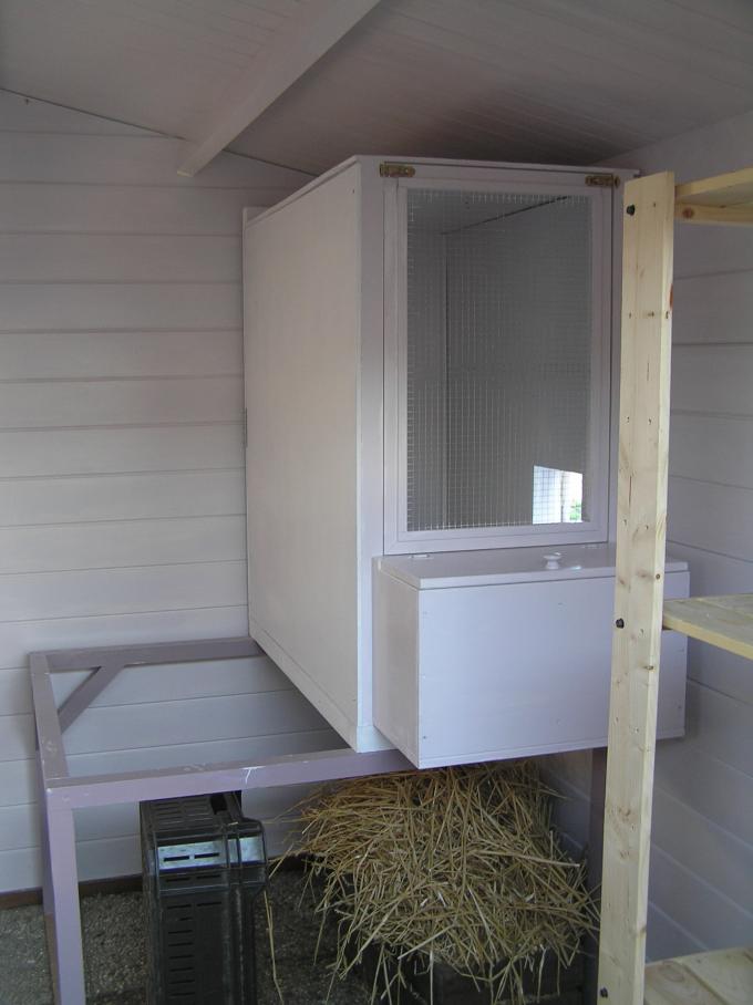 De legnestmodule. Hier kunnen twee kippen tegelijk eitjes in leggen.