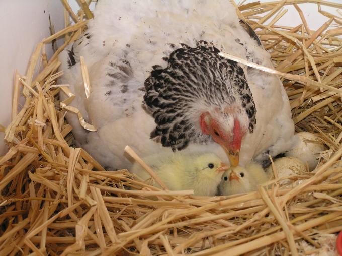 Het eerste nest: 6 kuikens. Met op de voorgrond Zwartje.